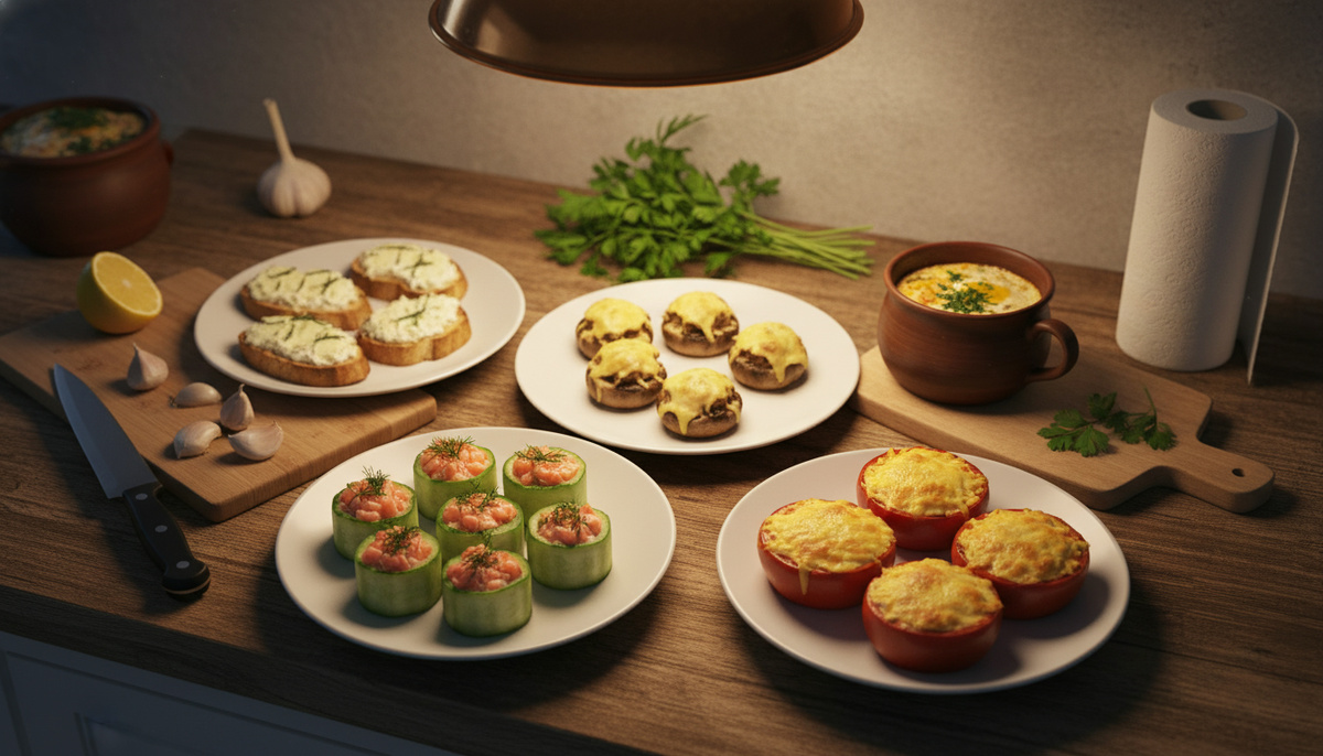 Если делать по уму, а не «как получится», то пять закусок на 23 февраля реально собрать примерно за час. Духовка занята — ты режешь огурцы. Микроволновка свободна — прогрел яйца и помидоры. Влажное держишь отдельно — и на столе всё выглядит как праздник, а не как «по дороге трясло».