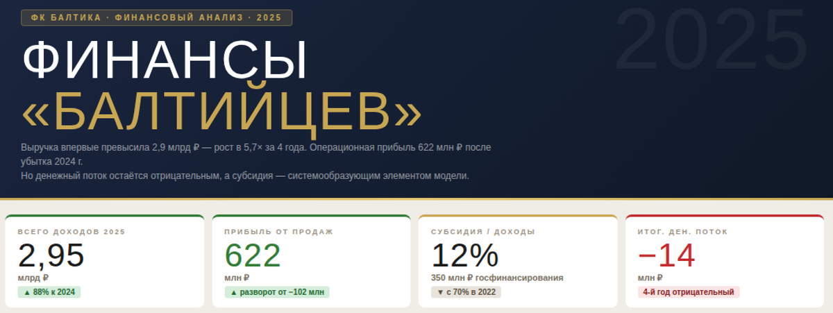 В 2025 году клуб показывает ~2,6 млрд руб. операционной выручки и ~3,0 млрд руб. совокупных доходов с учётом бюджетной субсидии. На первый взгляд — классический рост клуба, закрепившегося в РПЛ.