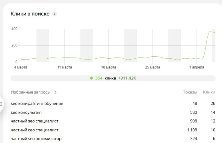 Покажу очень простой, но важный вывод из практики. Недавно я нормально переделал всего 3 страницы на сайте: — главную, — хаб по услугам, — страницу под SEO в Санкт-Петербурге. Что было до этого: — главная была слабой и по сути работала как просто цикл карточек; — страница по СПб фактически была заглушкой с одним заголовком; — коммерческий интент закрывался плохо. Что сделал: — полностью пересобрал шаблоны страниц; — усилил коммерческие блоки; — подогнал структуру под реальный page-to-page топ; — проверил текстовую релевантность по конкурентам и по своему анализу; — убрал ощущение «пустых» страниц, которые вроде есть, но не отвечают на задачу пользователя. Результат: — после переиндексации в Яндексе пошёл резкий рост кликов; — на скрине видно: 354 клика, +911,42%; — отдельно начали идти переходы по запросам, связанным с консультациями и коммерческими услугами. И здесь важный вывод. Часто проблема не в том, что “нужно ещё 100 страниц”. Проблема в том, что уже существующие коммерчес