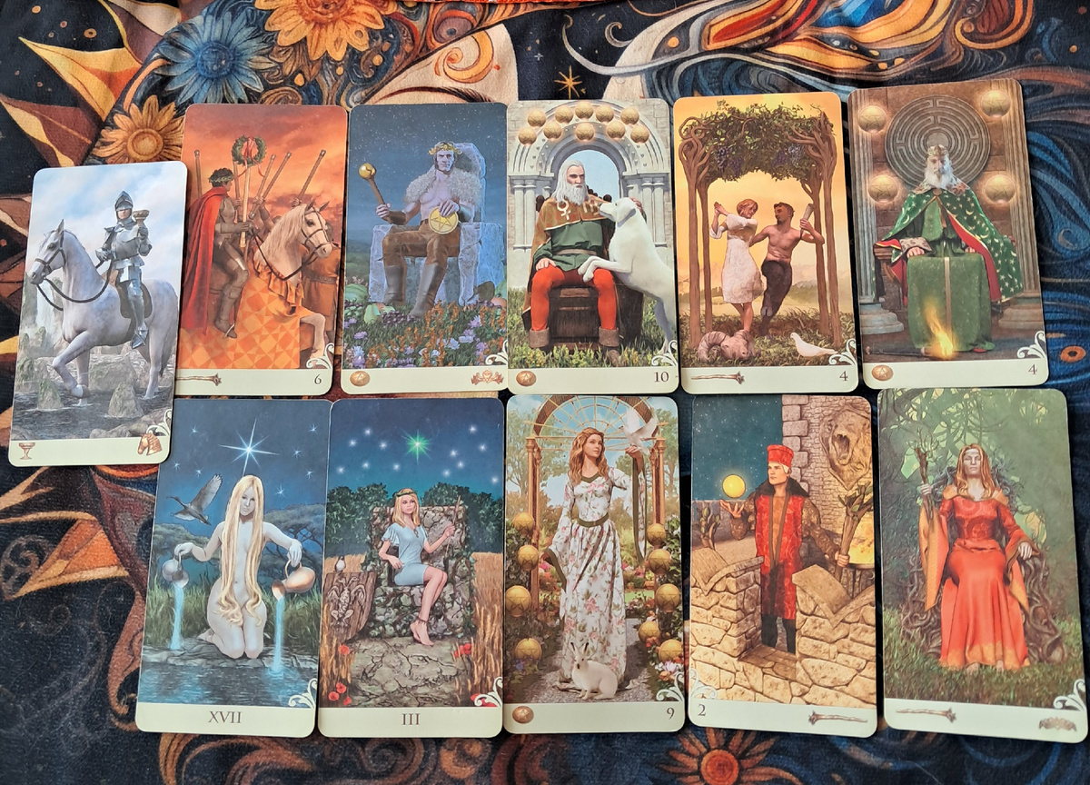 По вашему раскладу (6 жезлов, Король пентаклей, 10 пентаклей, 4 жезлов, 4 пентаклей, Звезда, Императрица, 9 пентаклей, 2 жезлов, Королева жезлов, итог Рыцарь кубков) вы отработали глубокие родовые ошибки, связанные с деньгами, властью, женской силой и закрытостью к любви. Итоговый Рыцарь кубков говорит, что теперь ваша душа свободна для нежных чувств — раньше это было заблокировано родом.