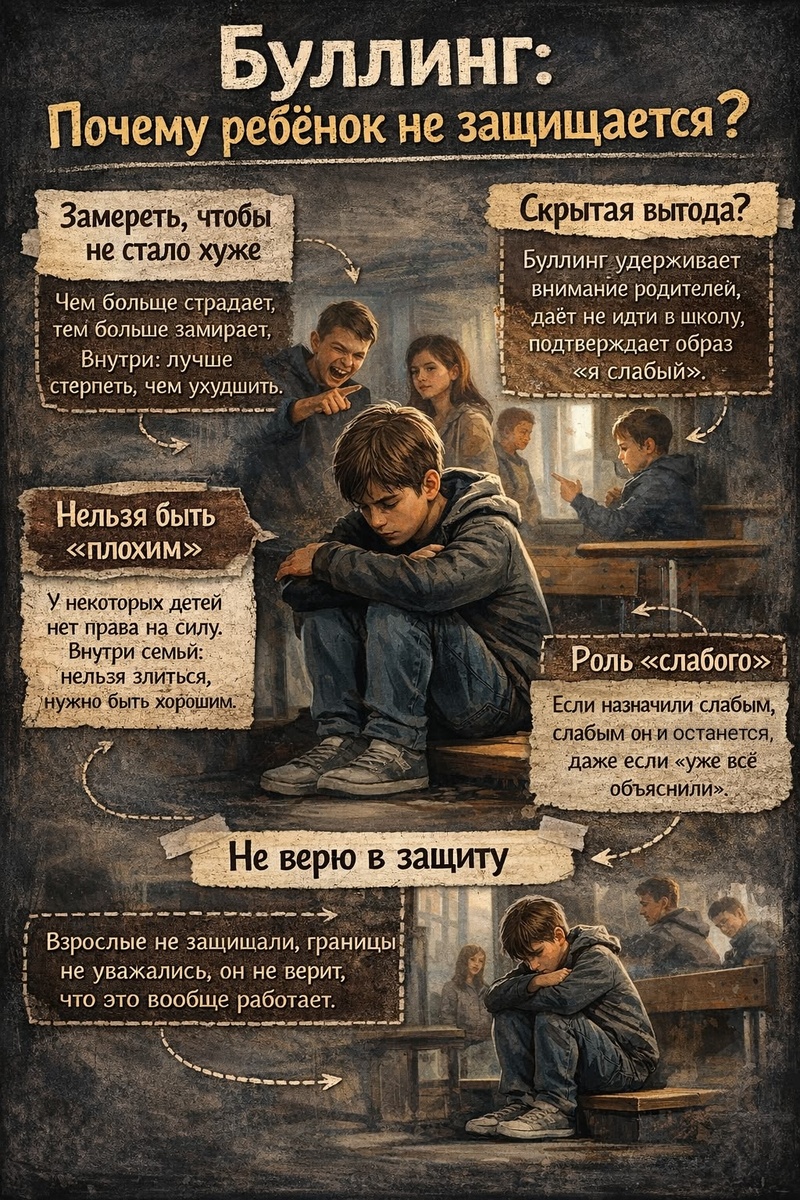 - важно не обижать других, то ребёнок не просто не защищается — он не имеет внутреннего разрешения на ответную силу