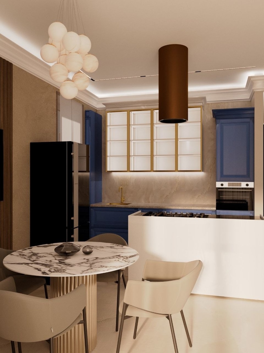 ² Кухня-гостиная выполнена в современном минималистичном стиле. Кухонный остров с интегрированной варочной панелью зрительно отделяет гостиную часть помещения от зоны приготовления пищи. Синий цвет кухонного гарнитура добавляет яркости помещению и отлично сочетается с теплым песочным оттенком стен. Использование вертикальных деревянных панелей добавляет интерьеру текстуру, а круглый обеденный стол служит центром композиции придавая завершенность. Ключевую роль в создании атмосферы играют осветительные приборы. Подвесной светильник с круглыми плафонами добавляет рассеянный свет над обеденной зоной, а линейные светильники обеспечивают равномерное освещение, подчёркивая контуры помещения. Уютная и стильная кухня-гостиная для отдыха и приема гостей. Закажи проект красивого дома! https://dzen.ru/id/626cbeeedbc3f92e2abfa411 vk.com/AB_ArtGelika АБ АРТГЕЛИКА в MAX ДЗЕН #ремонт #интерьер #дизайнинтерьера #доммечты #проектдома #архитектура #проекты #проектирование #коттедж #дизайндома #строитель