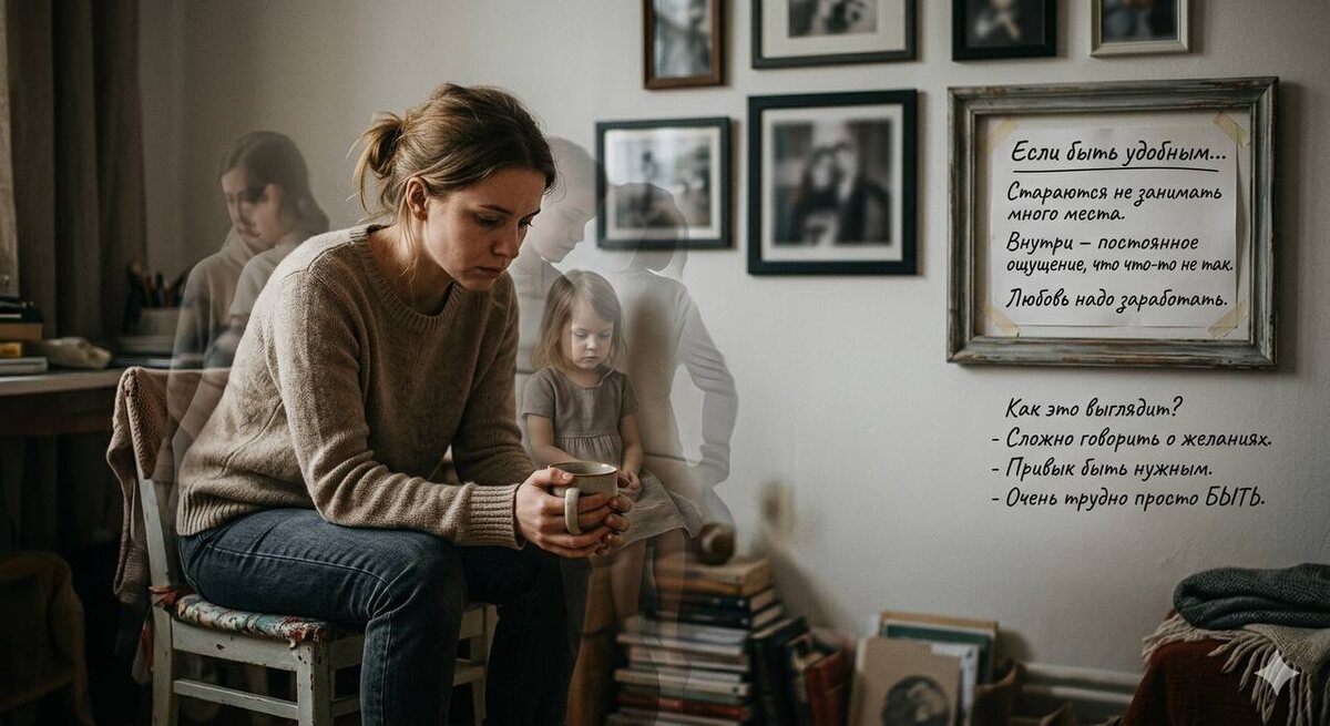 … Есть такой тип людей. Их не сразу видно. Но если знать, на что смотреть — узнаёшь сразу. Они обычно очень удобные. Стараются не занимать много места. Не просят лишнего. Соглашаются чаще, чем хотели бы. И при этом внутри — постоянное ощущение, что что-то не так. Что они недостаточно. Что нужно ещё немного постараться, и тогда наконец-то. Только это «наконец-то» не наступает. Я думаю, это один из самых незаметных следов детства, в котором тебя не принимали. Не обязательно жестоко. Иногда просто — не видели. Не интересовались. Оценивали, но не принимали. Говорили «ты должен быть лучше» чаще, чем «ты мне важен просто так». И ребёнок делает вывод. Не словами — ощущением. Что любовь надо заработать. Что сам по себе — недостаточно. Как это выглядит во взрослом возрасте? Человек очень болезненно реагирует на критику. Не потому что капризный — а потому что любое замечание попадает прямо в то место, которое и так давно болит. Ему сложно говорить о своих желаниях. Иногда он их просто не