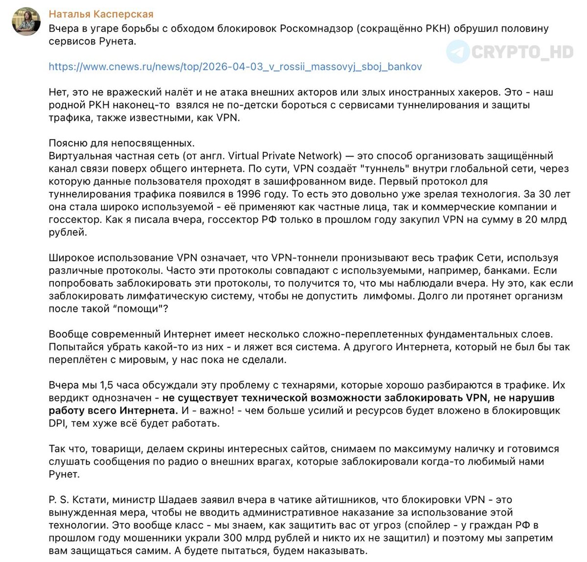 Попытки ограничить VPN уже приводят к сбоям. Проблемы с банковскими сервисами – это как раз последствия такой борьбы. VPN – это не только обход блокировок. Это базовый инструмент защиты данных, который используют банки, госсектор и бизнес. Только за прошлый год государство закупило такие решения примерно на 20 млрд. руб.. Говорить, что блокировка VPN – «вынужденная мера», чтобы не вводить штрафы для граждан, – странно. На фоне того, что мошенники за год украли у россиян около 300 млрд. руб., ограничивать инструменты защиты трафика выглядит просто абсурдно. ❗️P.S. Наталья Касперская уже извинилась перед Роскомнадзором за то, что обвинила ведомство в сбое банковских систем. Наталья Касперская – президент InfoWatch, соосновательница «Лаборатории Касперского». Ранее: - свобода доступа к информации - «цифровое сопротивление» Crypto Headlines