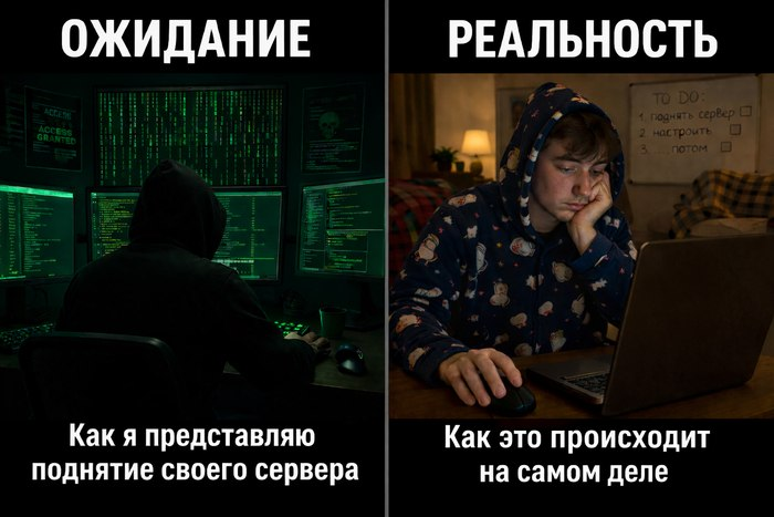 Настоящий сервер - это огромный гудящий черный железный шкаф с мигающими лампочками. Чтобы его «поднять», к вам домой должна приехать бригада грузчиков и бородатый сисадмин в свитере, от которого пахнет дата-центром и кофе. Это дорого, тяжело и требует высшего технического образования.