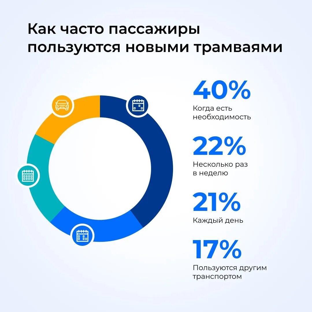 Когда в городе появляются новые трамваи, кажется, что изменения должны быть заметны сразу. Но в реальности всё работает иначе: сначала приходит интерес к новым вагонам, затем — комфорт от поездок, потом — доверие. И только после этого — привычка ездить именно так. Чтобы понять, как жители Курска и Липецка воспринимают обновление трамвайной системы, «Мовиста» провела опрос в соцсетях. Ответили более 400 человек — и их ответы выходят за рамки сухой статистики. Оказалось, что трамвай уже стал частью повседневной жизни для многих жителей: 40% пользуются им «по необходимости», а ещё 17% пока выбирают другой транспорт. То есть трамвай вернулся в город — но ещё далеко не для всех стал универсальным выбором. И это нормально для этапа, когда система продолжает обновляться, а транспортные привычки только формируются. Есть показатель, который не вызывает споров: