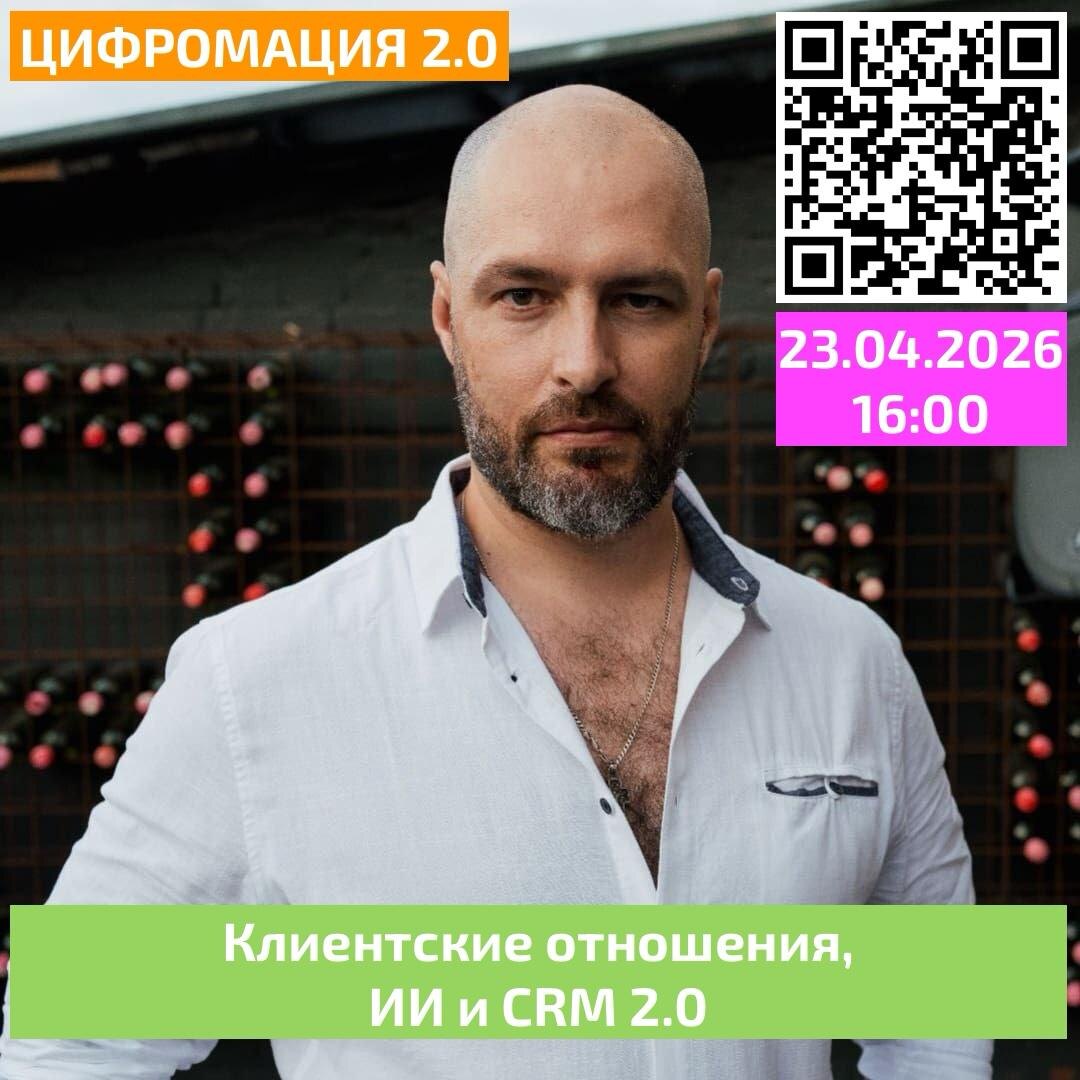 ! 23 апреля 2026 года пройдет конференция "Цифромация 2.0". Главной темой общения будет вопрос изменения отношений через CRM в эпоху влияния ИИ. Будут некоторые инсайты, будут инсайды и плодотворная дискуссия на животрепещущую тему. Основные тезисы: 👉 как меняются ожидания клиентов; 👉 где стандартного CRM-подхода уже недостаточно; 👉 как ИИ усиливает продажи и сервис; 👉 что такое CRM 2.0 в практическом смысле. Промокоды спешл фо ю: STEPAN100 — 5 Premium бесплатно STEPAN25 — 25% скидка на Premium и VIP для 100 участников Регистрация: https://цифромация.рф/conf/2.0/live.html#reg