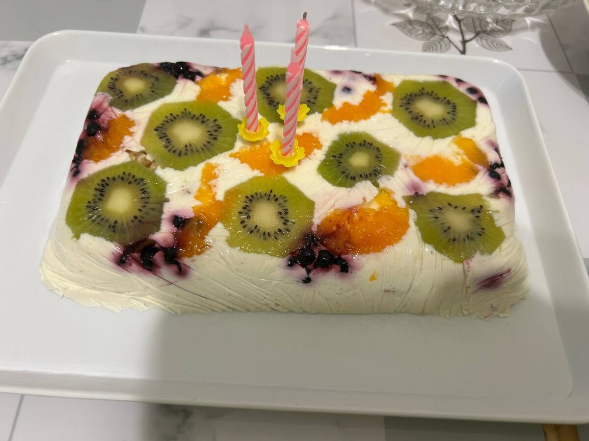 Понимаю, что это не тортик мечты на день рождения, но лучше уж такой вариант, чем никакой. 😁 В нем много белка и мало углеводов, чтобы не было скачка сахара! ✅Что нужно: Натуральный йогурт — 300 г Творог — 300 г Фрукты, ягоды, орешки (я взяла 1 киви, 1 мандарин и немного замороженной черники и грецкого ореха) Вода — 125 г Желатин — 30 г Подсластитель и корица — по желанию и по вкусу 1 шаг. Берем формочку или глубокую тарелку и застилаем пищевой пленкой. Фрукты нарезаем кружочками. И равномерно раскладываем фрукты, чернику и орешки на дне посуды. 2 шаг. В отдельной кастрюльке желатин заливаем водой для набухания. 3 шаг. В другой посуде творог с йогуртом взбиваем блендером, добавляем подсластитель. К подсластителям у всех разное отношение, я все-таки чуточку добавила. Чтобы не сочли за рекламу, не буду называть, чем пользуюсь сама. Также добавила корицу, потому что не раз читала, что она не допускает сильных скачков сахара. Кстати, если вам интересно, как сделать домашний йогурт без