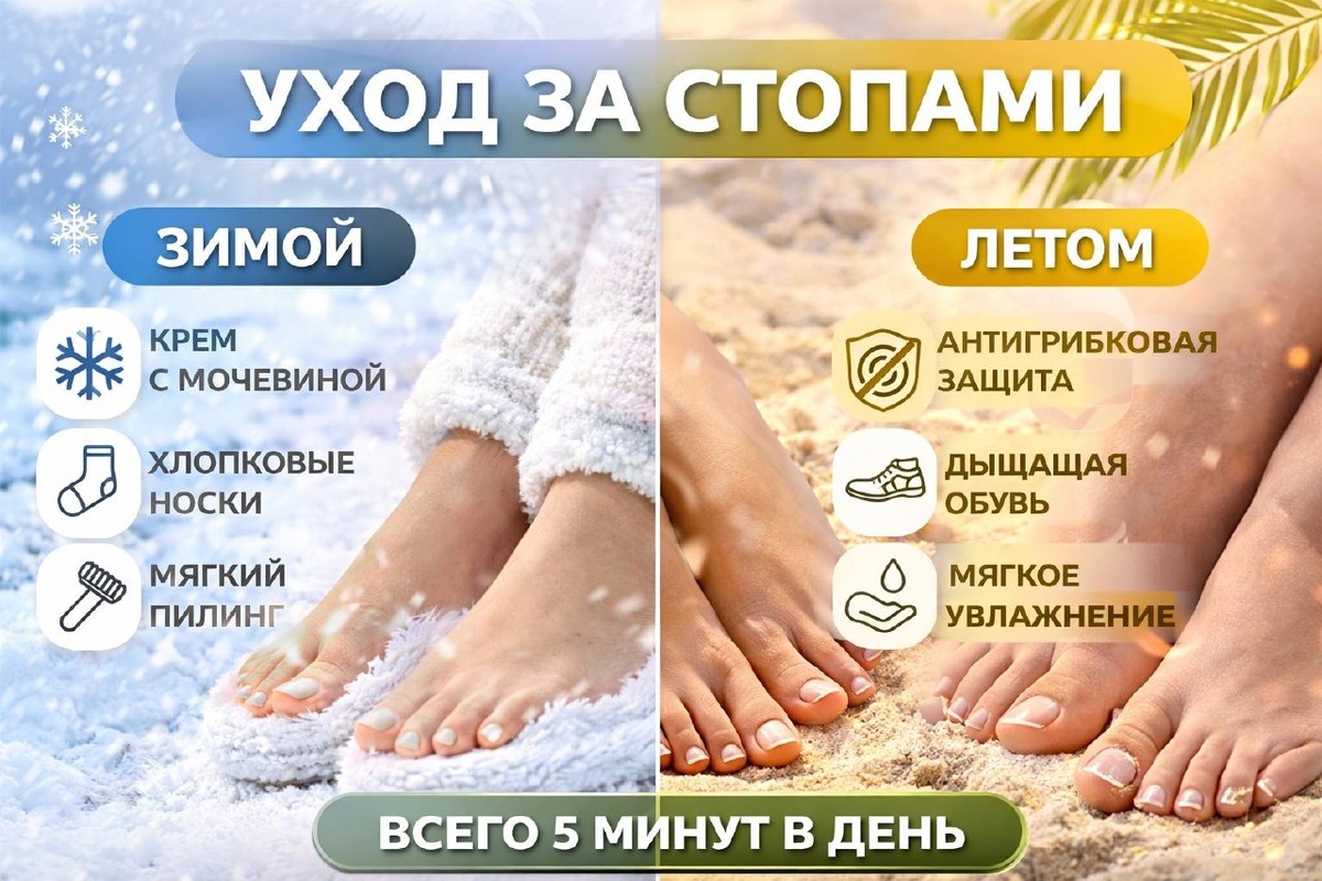 Зимой 🔹️сухость 🔹️трещины Летом 🔸️потливость 🔸️грибок 🔸️мозоли Если не менять уход - проблемы усиливаются Что делать: ❄️ Зима - питание и защита 🌞 Лето - лёгкость и антигрибковый уход Всего несколько минут в день и можно избежать серьёзных проблем 📌Если уже есть дискомфорт напишите «СТОПЫ» подскажу, что делать