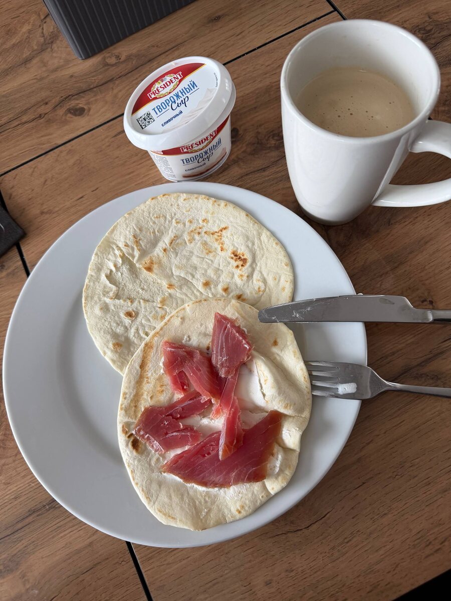 ». Сегодня быстрый завтрак - и мчу в тц. Детки на каникулах пока у папы, поэтому свободна как ветер - могу работать 24 на 7 🤪😂😚 Тунец, лепешка и творожный сыр. Кофе. Простая формула) холодильник пустой 😂