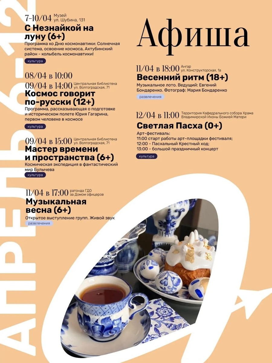 7–10 апреля «С Незнайкой на Луну» (6+) 📍 Музей Программа ко дню космонавтики Солнечная система, освоение космоса, Ахтубинский район – колыбель космонавтики. https://vk.ru/wall-211862206_1955 8 апреля, 10:00 | 9 апреля, 14:00 «Космос говорит по-русски» (12+)