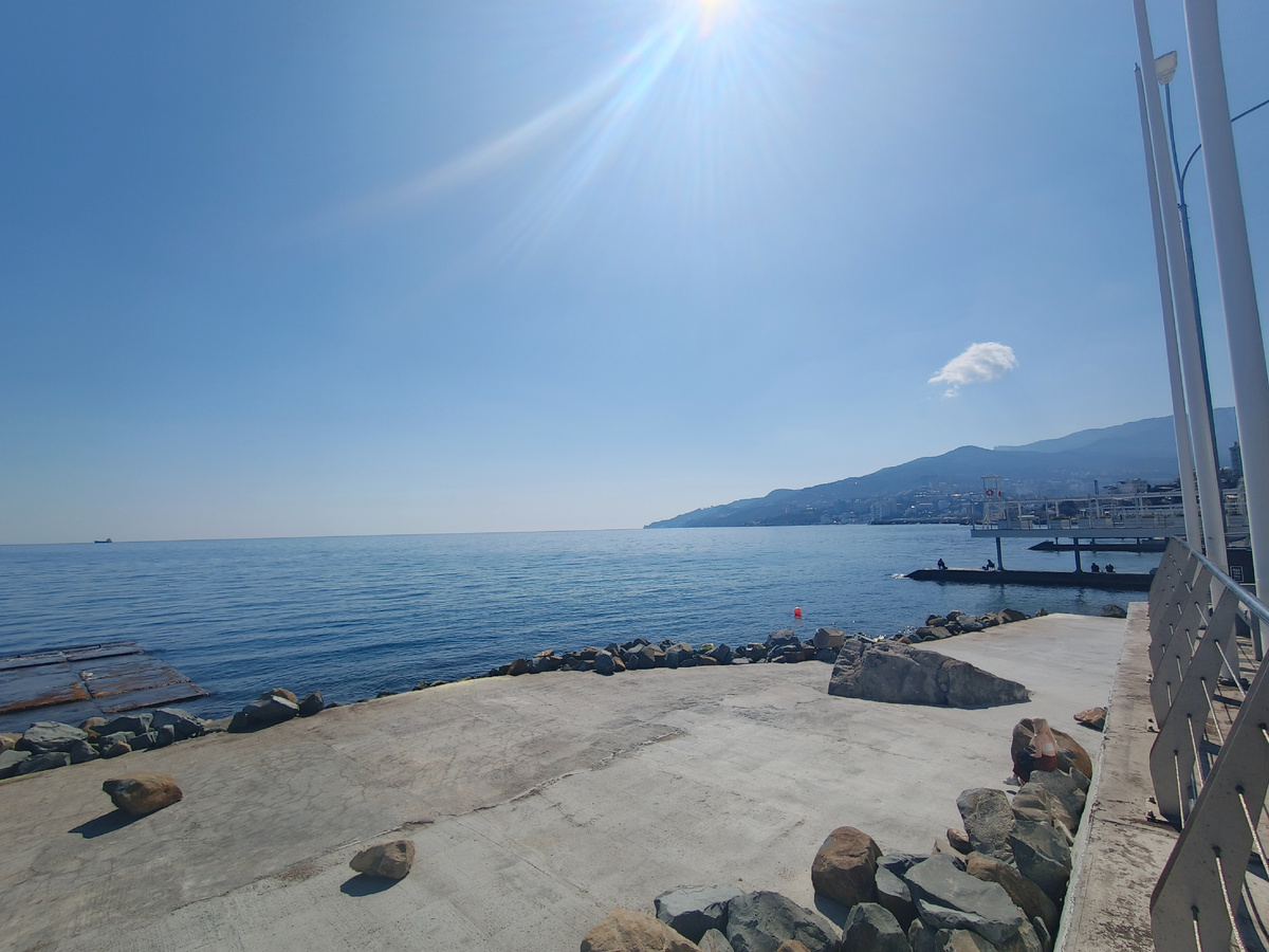 Вчера людей на Массандровском пляже ожидаемо было много, многие брали покрывала и устраивались прямо на гальке, загорали, слушали музыку, ели и пили. К ним на пару часов присоединились и мы с подругой, болтая о своём. А солнце уже неслабо припекает, судя по моему быстро обгоревшему лицу! Купаться, конечно, в ледяной воде (всего +8) не получится, а вот загореть можно легко.