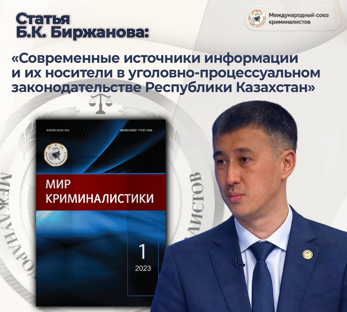 Статья начальника центра по исследованию проблем криминалистического обеспечения деятельности ОВД Научно-исследовательского института Карагандинской академии МВД Республики Казахстан имени Б. Бейсенова Бейбита Кайратовича Биржанова «Современные источники информации и их носители в уголовно-процессуальном законодательстве Республики Казахстан», опубликованная в первом номере журнала «Мир криминалистики» за 2023 год. Ознакомиться со статьей #МеждународныйСоюзКриминалистов #МСК #БейбитКайратовичБиржанов #РеспубликаКазахстан