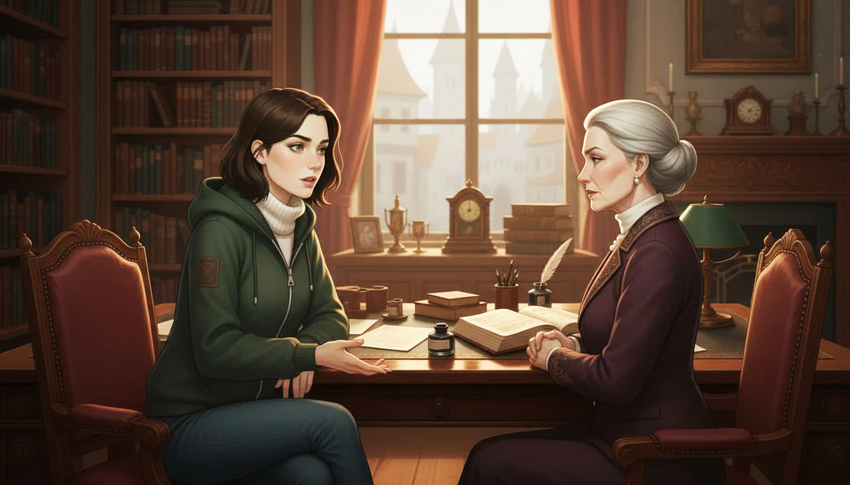 Хранительница провела Юлю в маленькую комнату за стойкой администратора. Юля и не знала, что там есть какая-то комната — дверь всегда была закрыта, и выглядела она как обычная стена с обоями. Но стоило женщине провести по ней рукой, и дверь бесшумно отворилась, открывая уютное пространство с низким потолком, старым дубовым столом, парой кресел и камином, в котором весело потрескивал огонь.