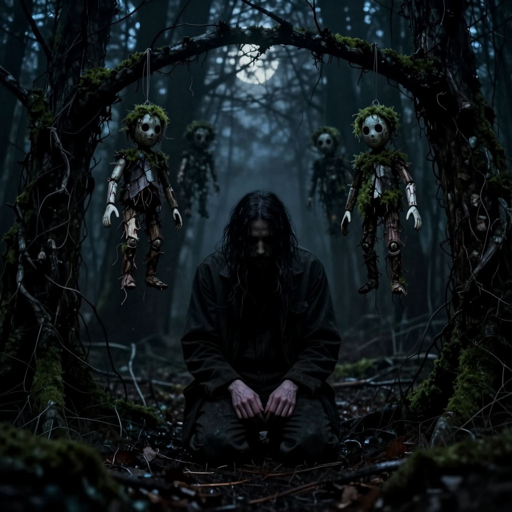 Он стоял посреди леса, а вокруг на ветвях висели они — те, кого он кормил. Куклы из коры и мха, с глазами-щелями, из которых сочилась смола. Они раскачивались в унисон и пели — низко, тягуче, как ветер в печной трубе.