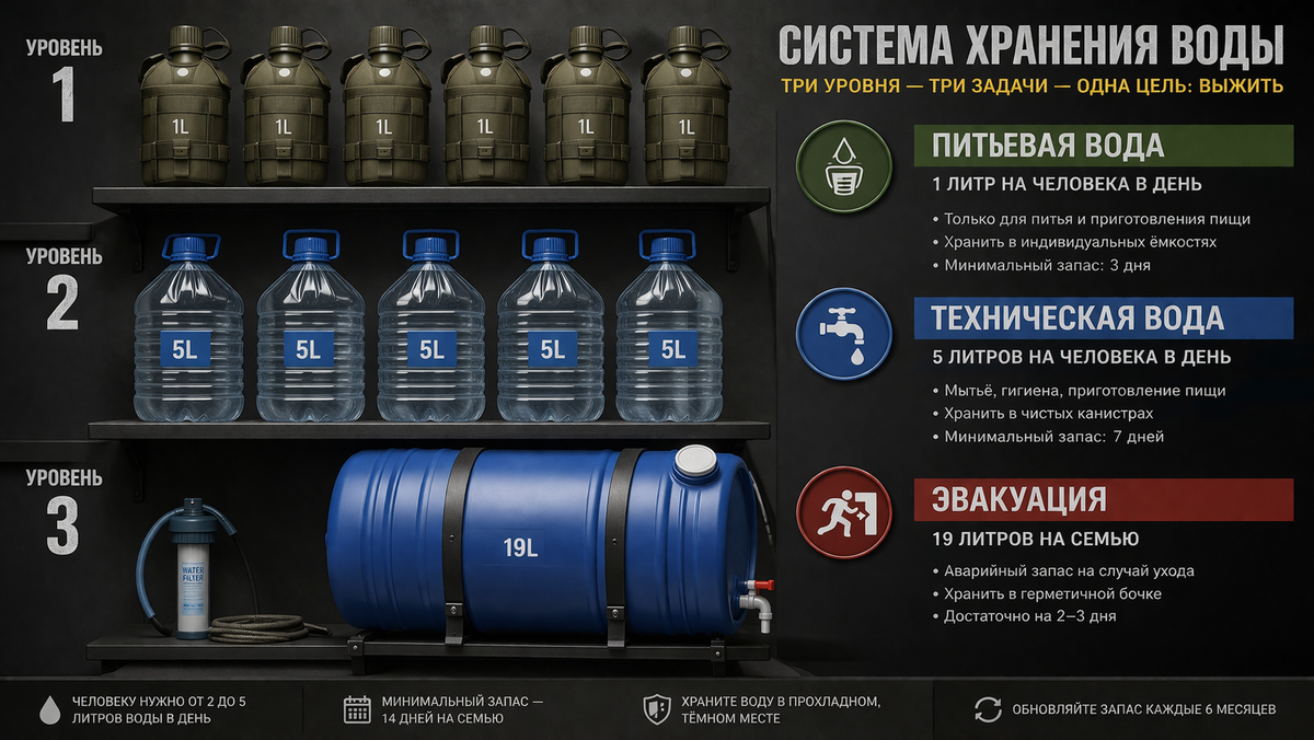 Ваш запас воды должен быть эшелонированным.