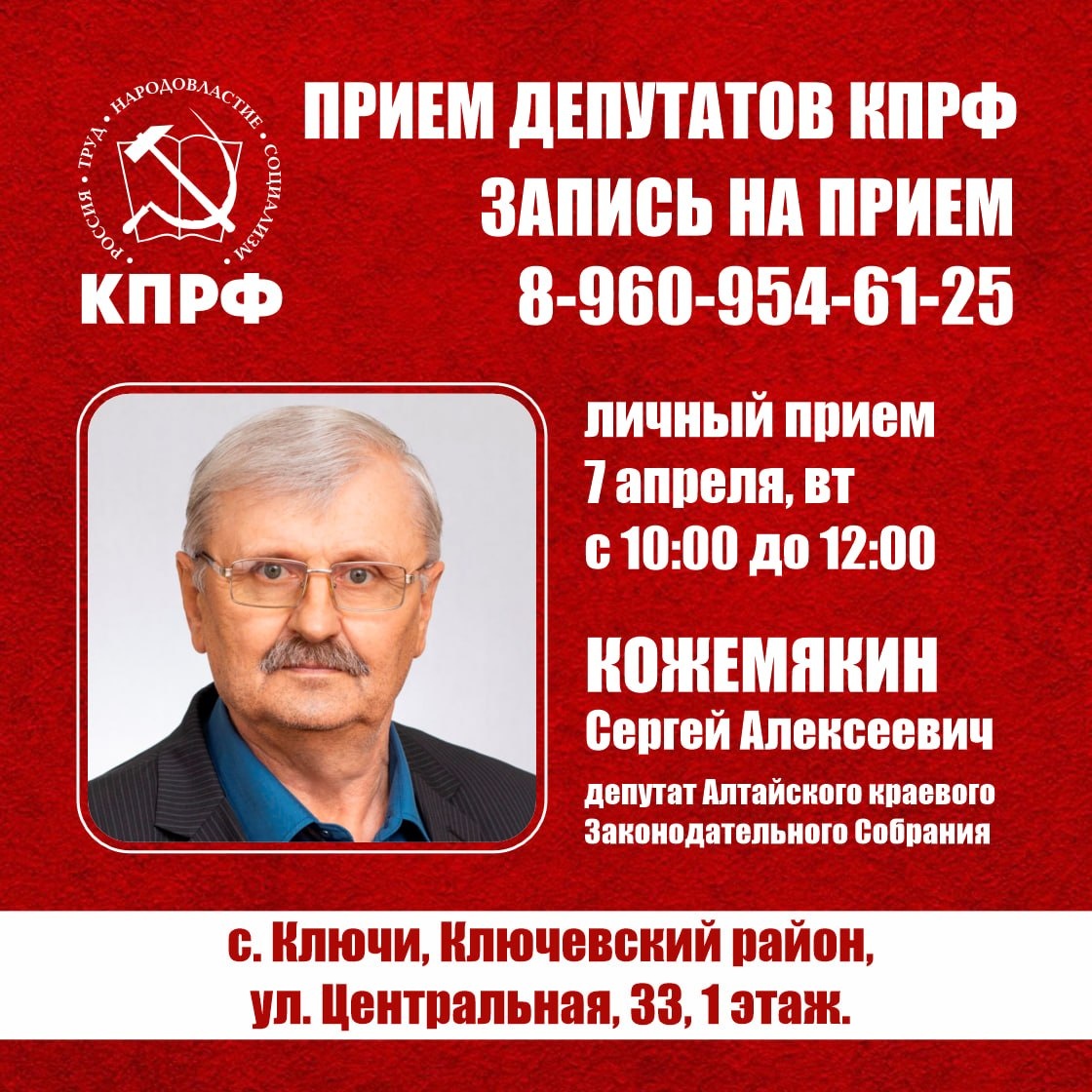 : ЛИЧНЫЙ ПРИЕМ КОЖЕМЯКИН С.А., депутат АКЗС 📌7 апреля, вт, 10:00-12:00, с. Ключи, Ключевский район, ул. Центральная, 33, 1 этаж. ☎️ Запись на прием по тел. 8-960-954-61-25