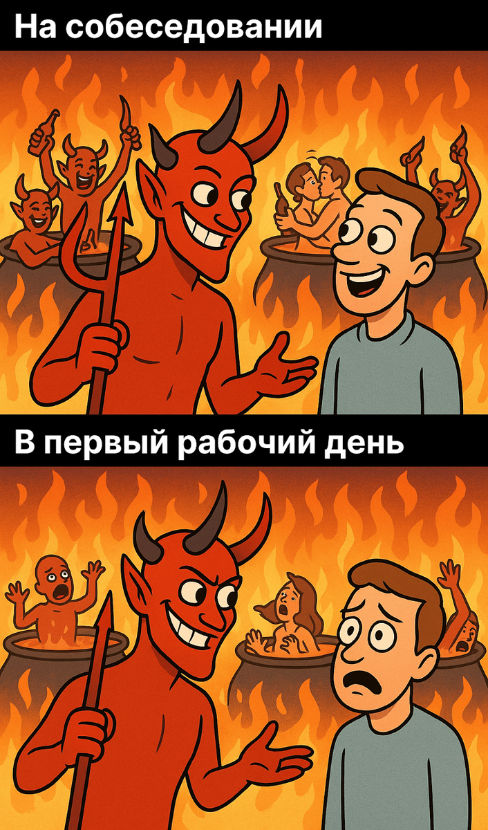 Когда ты годами работаешь в одной компании, особенно в бирюзовой бирюзе с фруктами, тимбилдингами и эджайлом, выход в рынок труда ощущается как если выбросить слепого котенка на мороз. Однажды со мной случилось именно это, когда в моей бирюзовой компании настали тяжелые времена и пришлось расстаться с половиной сотрудников. Я начала поиски работы. Это когда ты откликаешься а в ответ тишина, собеседования которые похожи на цирк с конями, офферы с кучей НО и мелким шрифтом в углу и куча отказов. Я уже успела опустить лапки, но вдруг мне позвонили из «Крупной стабильной финансовой компании, которая давно на рынке». Звучало солидно, и тут же в моей душе появился луч надежды. Но первый редфлаг не заставил себя долго ждать: «Собеседование строго оффлайн». Странно в эпоху Zoom’ов. Ладно, успокаиваю себя тем, что это другая сфера и другие нравы. Финансы же, там, наверное, секретность. Приезжаю по адресу. Здание не просто немодное, оно прям страшное. Кирпичный куб в промзоне города, похожий на