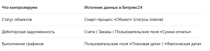 Дебиторская задолженность - Фильтры: (опционально) статус не равен «Сдача ГК/акта» — чтобы видеть только активные объекты.