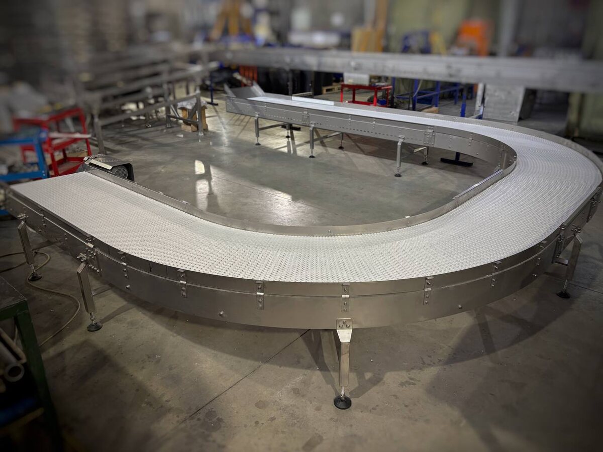 Решение для перемещения охлаждённых булочек без смещений и с сохранением положения продукта на ленте. Параметры: • Ширина ленты: 579 мм • Длина: 11200 мм • Поворот: 2×90° • Скорость: 6 м/мин (регулировка ±30%) • Высота входа/выхода: 550 ± 25 мм Конструкция: • Модульная лента POM/SS с зацепами • Рама и ограждения из нержавеющей стали • Шибер для ручного перенаправления потока • Стационарное исполнение, установка на опорах Привод: • Червячный мотор-редуктор, IP55 • Расположение справа по ходу движения • Кожух из нержавеющей стали Обеспечивает стабильное прохождение поворотов и аккуратную транспортировку продукта в составе линии. В этом посте есть большое видео, которое не загрузилось в Дзен. Откройте оригинал поста в телеграме, чтобы его посмотреть