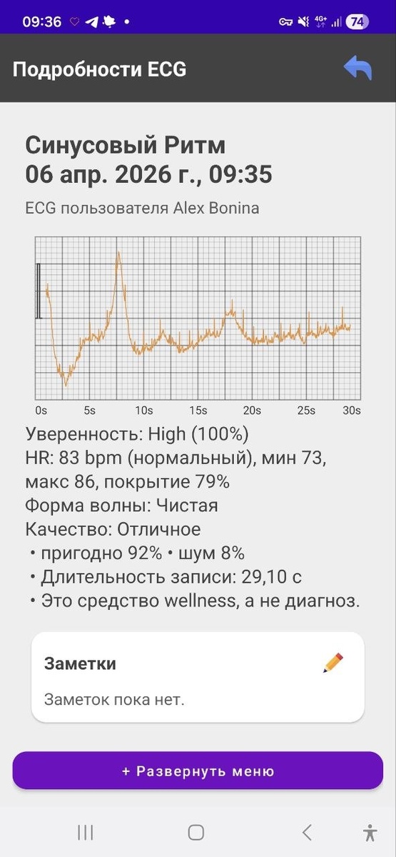 ! Наконец-то я смогла воспользоваться функцией измерения ЭКГ на своих часах Самсунг😁 Если кто не знает, на часах встроена такая функция, но несколько лет уже базовое приложение samsung healh monitor для этих функций не работает в РФ. Один умелец решил создать приложение сам) Я примерно полгода ожидала выпуска приложения, а сегодня утром получила уведомление, что запустили бета-версию🎉 Вот результаты моего первого измерения) Не уверена, что мне жизненно необходимо это измерять😂 но приятно, что теперь я могу пользоваться всеми функциями, за которые заплатила😄