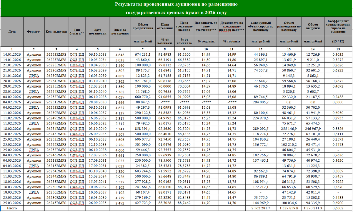 В январе-феврале 2026 года Минфин взял с рынка больше, чем погасил и выплатил купонов по ОФЗ: на 541 млрд руб. Посмотрим, какой баланс образовался за первые три месяца этого года. За январь-март Мифин РФ разместил следующие выпуски ОФЗ: Выручка за этот период составила 1 370 млрд руб. При этом в январе 2026 года Минфин выплатил 237 млрд руб. в феврале 67 млрд руб. в марте 913 млрд руб. В итоге положительный баланс между размещением и погашением резко снизился до 152 млрд руб. В апреле погашений не будет, но общая выплата купонов существенная - 410 млрд руб. Диаграммы: Удачи и трезвого анализа в ваших инвестициях!!! P.S. Подписывайтесь на мой телеграмм-канал: https://t.me/Cervonets