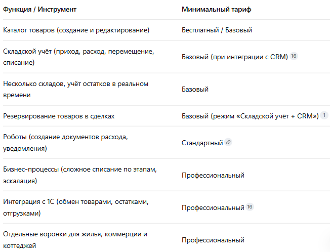 - Встроенными роботами Битрикс24 нельзя автоматически создать документ расхода — для этого потребуется бизнес-процесс или приложение-расширение. Ручное создание расхода занимает 2–3 минуты на один этап, что для 5–10 объектов приемлемо.