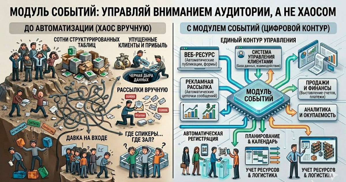 Десять звонков в минуту, рассерженные клиенты у входа и потерянная база потенциальных покупателей — такова цена «ручного» управления мероприятием, когда данные застревают в почте или таблицах. Модуль событий превращает этот хаос в предсказуемый процесс, где регистрация, оплата и аналитика работают в одном контуре. Главный вывод: компания перестает тратить время на перекладывание бумажек и начинает управлять вниманием аудитории, превращая каждое событие в измеримый актив. Архитектура надежности: почему «Excel» больше не справляется Когда на вебинар или выставку записываются сотни людей одновременно, обычные офисные программы становятся «бутылочным горлышком». Профессиональный модуль событий строится на ином фундаменте. Представляется разумным использовать серверные решения на базе Linux, которые обеспечивают бесперебойную работу системы даже при пиковых нагрузках. Это позволяет избежать ситуации, когда сайт «падает» в самый ответственный момент регистрации. Вместо написания бесконечных