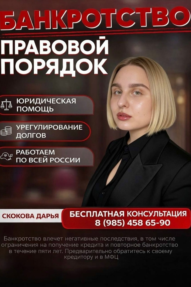 ? Рассмотрите процедуру банкротства как один из вариантов правового решения вашей проблемы! На бесплатной консультации: -проанализируем вашу ситуацию с задолженностями; -объясним сроки и условия прохождения процедуры, есть ли возможность пройти ее без вашего участия в суде, как быстро собрать пакет документов 📝 Запишитесь ко мне на бесплатную консультацию по процедуре банкротства: Скокова Дарья Денисовна Телефон: 89854586590 🟢ВК: https://bankrot.solutions/4ttebi8 🟢ТГ: https://bankrot.solutions/4tcO9jL 🟢MAX: https://bankrot.solutions/4sepz0s Пост ВК