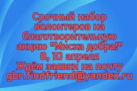 ❗️❗️❗️ Москва. Московская область. Организатор выставок «Найди друга» Центр защиты животных АНО «ГБР.Зоозащита» объявляет набор на благотворительную акцию «Миска добра» - сбор гуманитарной помощи животным без хозяина. В рамках акции возможно пристройство хвостатых участников! Акция будет проходить с 23 марта по 12 апреля, каждый день в ТЦ «Глобал Молл», Москва, м. Автозаводская, ул. Ленинская Слобода, д. 26, стр.2 Для участия возможны любые интервалы по времени с 12 до 20 часов. Но не менее 5 часов. К акции допускаются кошки, котята, щенки, собаки до среднего размера. Возможно участие котят и щенков не привитых по возрасту, но клинически здоровых! Нужно привезти для кошек свои клетки, для щенков можно клетки или манеж. Стол предоставит ТЦ. Весь собранный за день корм забирает собиравший его куратор. 1 день - 1 куратор и его подопечные. Справки из госветстанции не нужны. Заявки принимаются на почту gbr.findfriend@ya.ru. 1 дата - 1 животное - 1 письмо В теме письма - Миска добра, к