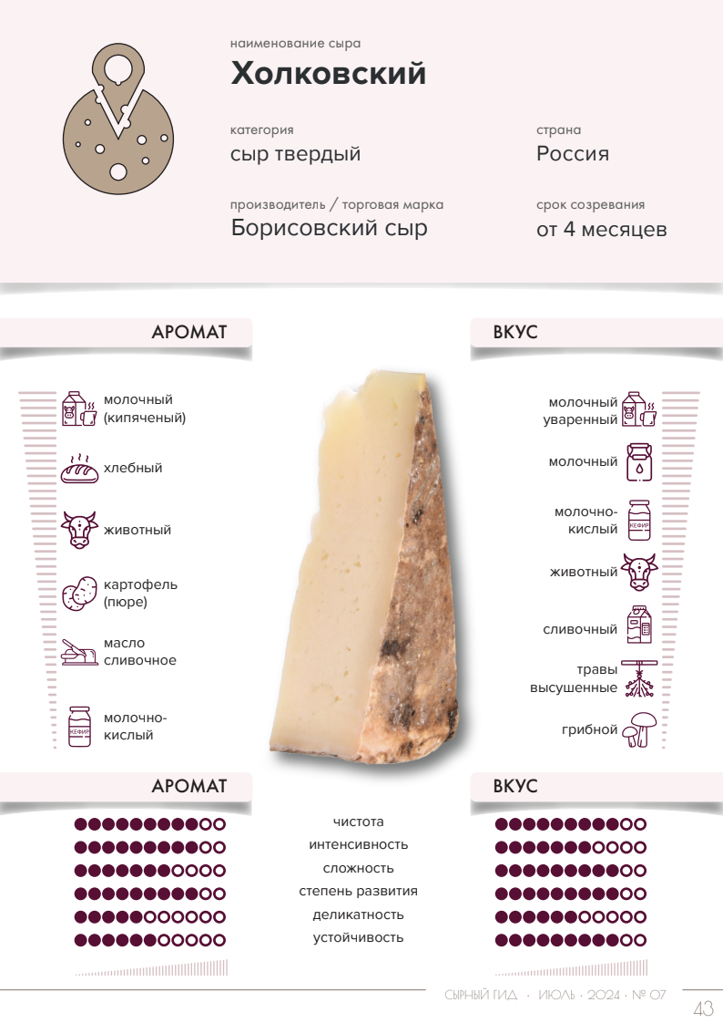 Сыр давно уже стал частью нашего ежедневного рациона. Но иногда из-за разнообразия в магазинах и сырных лавках легко растеряться. Твердые и полутвердые сыры идеально подходят, чтобы дополнить привычный рацион. Познакомимся с некоторыми образцами, которые попали в журнал "Сырный гид". В аромате доминируют кипяченое молоко, хлебная корочка, нюансы аромата – животный, ферментированный, сливочное масло, молочнокислый. Вкус сыра достаточно чистый, достаточно сложный, с интенсивностью выше среднего уровня. Вкус с доминированием молочного, молочного уваренного тонов, дополняемых сливочным, молочнокислым, животным, грибным, нюансами, нюансом высушенных трав. Сыр подойдет для разнообразия сырной тарелки, а также дополнит холодные блюда. Ароматика сыра чистая, отчетливая, несложная, интенсивность - выше умеренного уровня. Доминанты классические – молочный и молочный уваренный тона. Нюансы аромата - молочно-кислый, сметана, животный. Вкус сыра чистый, достаточно интенсивный, несложный. Вкус с до