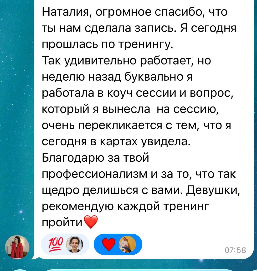 ✨ Гадать не буду. Рисовать абстракции — тоже. Я создаю для вас две индивидуальные метафорические карты, основанные исключительно на ваших словах о состоянии. Карта №1. «Ситуация» Это зеркало вашего запроса. Я переношу на бумагу ту самую запутанную ситуацию, где болит, страшно или непонятно. Вы увидите её со стороны без искажений. Карта №2. «Ресурс» Антидот к проблеме. Это ваша личная суперсила, спрятанная в подсознании. Карта подскажет, куда опереться и откуда взять силы прямо сейчас. Как это работает: Вы пишете мне 3-5 предложений о том, что вас тревожит. Я создаю два уникальных образа (не шаблонов!), которые станут для вас подсказками. Никакой магии, только честная психология через метафору! На фото отзыв о том, как работают метафорические карты, с тренинга, который я проводила вчера 🤩