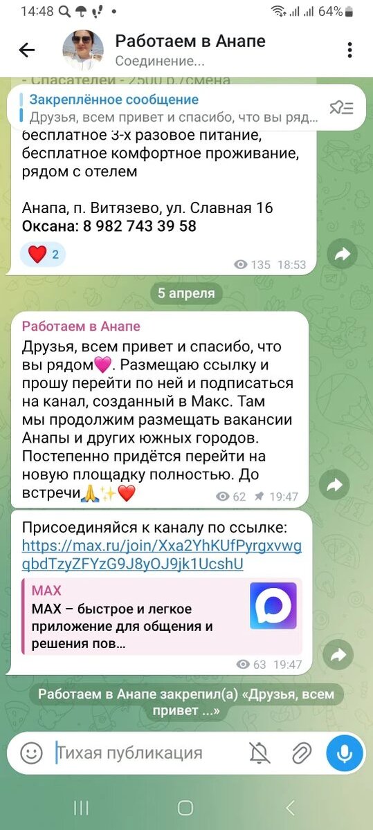 Я два года работала над созданием канала для размещения вакансий, чтобы он был именно для кандидатов, чтобы вы могли в любое время бесплатно зайти и найти работу по душе. Набрала почти 400 подписчиков, но всё закрыли по известным обстоятельствам. Теперь я перешла в "Макс" и написала всем сообщение, чтобы переходили со мной на Макс. Туда я размещаю, разыскивая для вас, самые лучшие предложения Краснодарского края, и пытаюсь помочь в поиске работы, особенно переезжающим на ПМЖ. Давайте посмотрим, какие вакансии Анапы на сезон 2026 разместили работодатели сегодня.