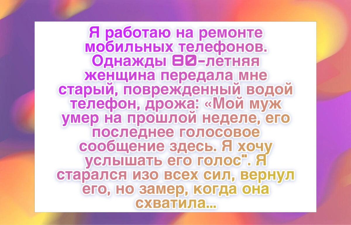 “Я работаю в киоске по ремонту телефонов в торговом центре. Обычно у меня разбитые экраны, утопленные телефоны и нетерпеливые подростки. В прошлую среду ко мне подошла женщина лет восьмидесяти и протянула старый кнопочный телефон, залитый водой. У нее дрожали руки. Она спросила, могу ли я включить его еще хотя бы один раз. Я посмотрел на разъем, на плату и понял, что телефон фактически мертв и ремонту не подлежит. Она закрыла лицо руками и заплакала прямо посреди торгового центра. Сквозь слезы она сказала, что ее муж умер на прошлой неделе, и на этом телефоне осталось его последнее голосовое сообщение, и ей нужно услышать его еще раз. Я остался после работы и три часа пытался что-то сделать. В итоге мне удалось на пару минут запустить телефон, я быстро включил сообщение и записал звук на флешку. Когда я отдал ей запись, она обняла меня так крепко, что я не мог вдохнуть. Технологии меняются каждые полгода, а воспоминания должны оставаться навсегда.”