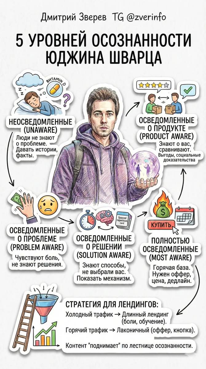 Продолжаем серию про гуру. Ранее рассмотрели Керна, Хэлберта, Чаперона и Сеттла. А сейчас - Юджин Шварц. Это легендарный копирайтер и автор книги «Breakthrough Advertising». Он дал маркетингу одну из фундаментальных концепций - 5 уровней осознанности аудитории. Главная мысль: эффективность вашего текста зависит не от красоты слов, а от того, насколько точно вы попали в текущее состояние ума читателя. Ошибка 90% экспертов в инфомаркетинге - попытка продать «в лоб» ледяной аудитории. Нельзя предлагать цену и оффер тому, кто еще не понял, что у него есть проблема. Как работать с разными уровнями осознанности: ➡️ Неосведомленные: люди не знают о проблеме. Здесь нельзя продавать. Нужно давать истории и контр-интуитивные факты. Пример (здоровье): Расскажите о «тихом убийце» продуктивности — скрытом дефиците витамина D, из-за которого человек чувствует усталость, даже если спит по 8 часов. ➡️ Осведомленные о проблеме: они чувствуют боль, но не знают, как её убрать. Пример (личные финансы): Оп