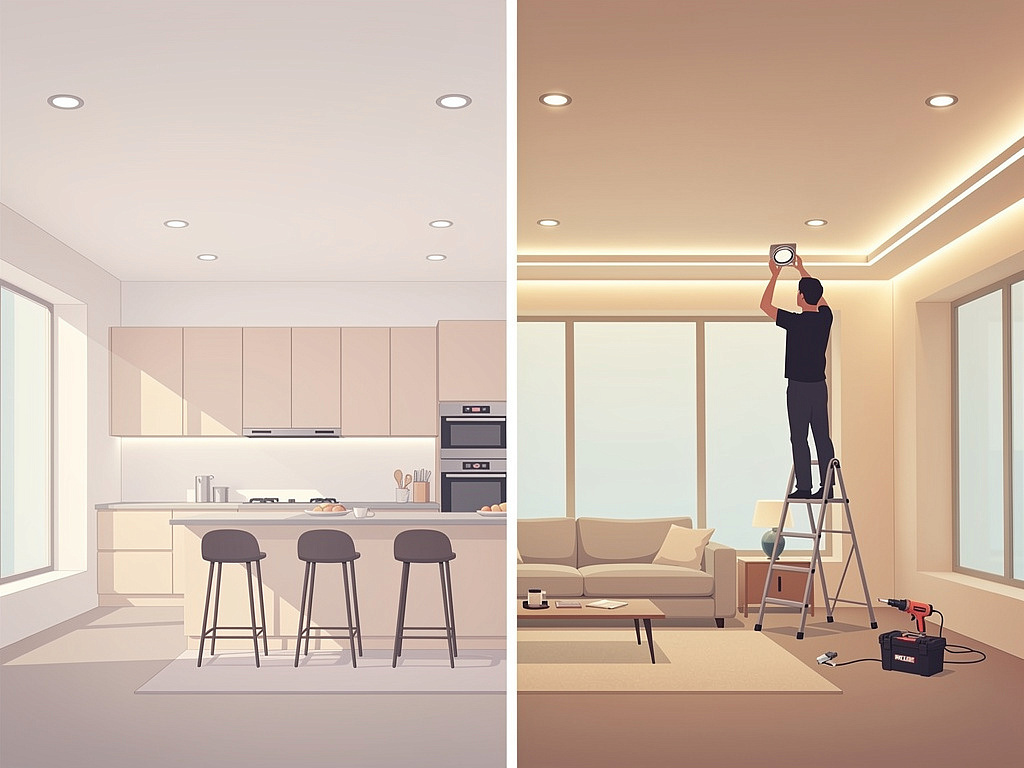 Почему это важно: кухня требует яркого света над столешницей, гостиная — мягкого. Один потолок не всегда справляется, если не продумать сценарии освещения заранее.