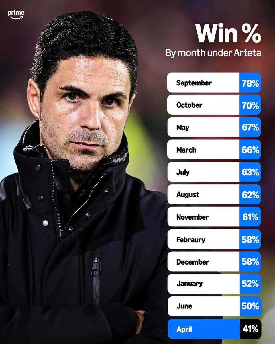 Апрель — исторически худший месяц для "Арсенала" при Микеле Артете. "Канониры", тревожно? 🤔