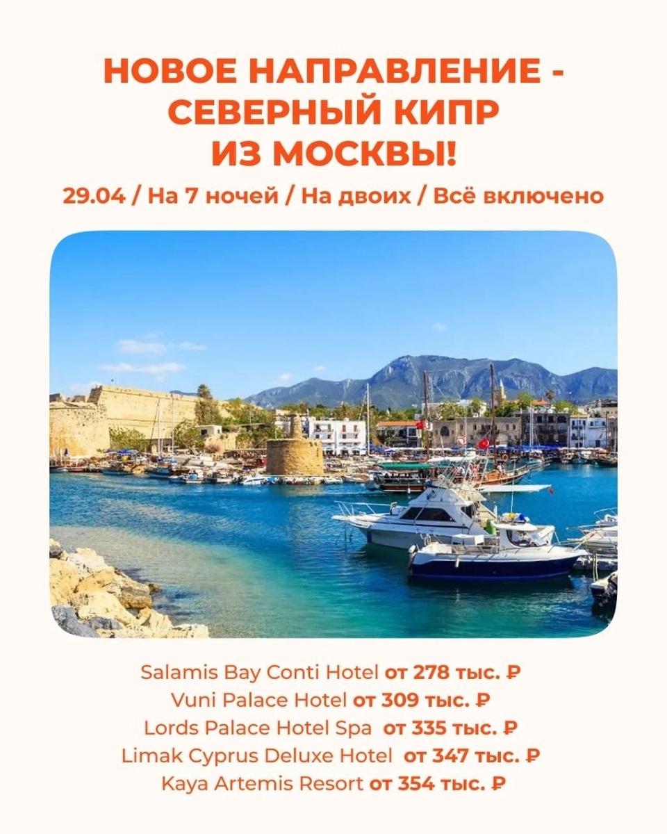 🆕 Средиземное море, температура воздуха около +25°C уже в конце апреля, горы, замки, оливковые рощи и длинные песчаные пляжи — хорошая альтернатива Турции и Египту на майские праздники 29.04 / На 7 ночей / На двоих / Всё включено ✨ Salamis Bay Conti Hotel от 278 тыс. RUB На территории античного заповедника с прямым выходом к руинам Саламиса и мелководным песчаным пляжем, где можно встретить морских черепах ✨ Vuni Palace Hotel от 309 тыс. RUB В пешей доступности от центральной гавани Кирении, предлагает бесплатный трансфер в город, поэтому сюда едут те, кому важна близость к ресторанам, портам и замкам ✨ Lords Palace Hotel Spa от 335 тыс. RUB Панорамный бассейн на крыше и современный пляжный клуб в стиле европейских курортов ✨ Limak Cyprus Deluxe Hotel от 347 тыс. RUB Огромный аквапарк и большая детская зона на первой линии экологически чистого залива ✨ Kaya Artemis Resort от 354 тыс. RUB Главное здание - копия античного Храма Артемиды с колоннами в полный рост ✅ В стоимость вкл