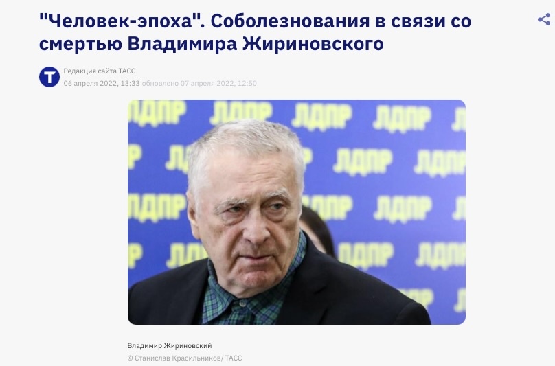 06.04.2022: В этот день умер Владимир Жириновский; NYT подтвердила подлинность видеозаписи, на которой украинские солдаты расстреливают связанных российских пленных; Кабмин Украины разрешил терробороне применять артиллерию и ракетные системы (ранее им было разрешено использовать только стрелковое оружие).
