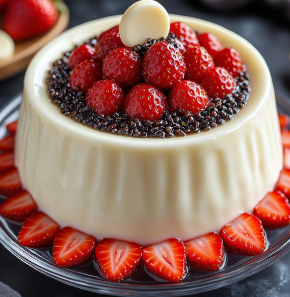 - Клубнику нарежьте ломтиками, залейте смесью клубничного сока и желатина, выложите сверху на застывшую панакоту.