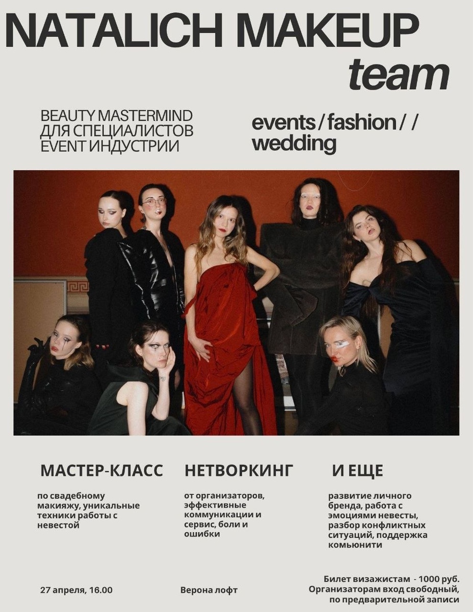 #СанктПетербург #офлайн 🗣BEAUTY мастермайнд от команды Natalich makeup team для стилистов и специалистов event индустрии🗣 Все мероприятия недели (с 27.04 по 3.05.2026) доступны по хештегу: #27апр_3мая26 ⏰ 16:00 📍 Верона Лофт 1-я Красноармейская ул., 11В 💰 Бесплатно для организаторов, визажистам — 1000 руб ❗️ Регистрация BEAUTY мастермайнд от команды Natalich makeup team для стилистов и специалистов event индустрии Вас ждет: ✔️Мастер -класс по макияжу от Юли Наталич. Уникальные техники работы с невестой ✔️Мейкап станции со стилистами ✔️Нетворкинг от организаторов. Как начать работать в свадебной индустрии, на что обратить внимание. Эффективные коммуникации и сервис. Боли и ошибки ✔️Обратная связь от невесты: психологические нюансы работы, клиентский взгляд на стилиста, основные аспекты выбора подрядчика Подарки от спонсоров А ЕЩЕ: - РАЗБЕРЕМ СЛОЖНЫЕ СЛУЧАИ В РАБОТЕ УСТРОИМ БРЕЙНШТОРМ ДЛЯ ПРОДВИЖЕНИЯ ЛИЧНОГО БРЕНДА - НАЙДЕМ РЕШЕНИЕ КОНФЛИКТА С ЗАКАЗЧИКОМ ИЛИ КОЛЛЕГАМИ - ПОВ