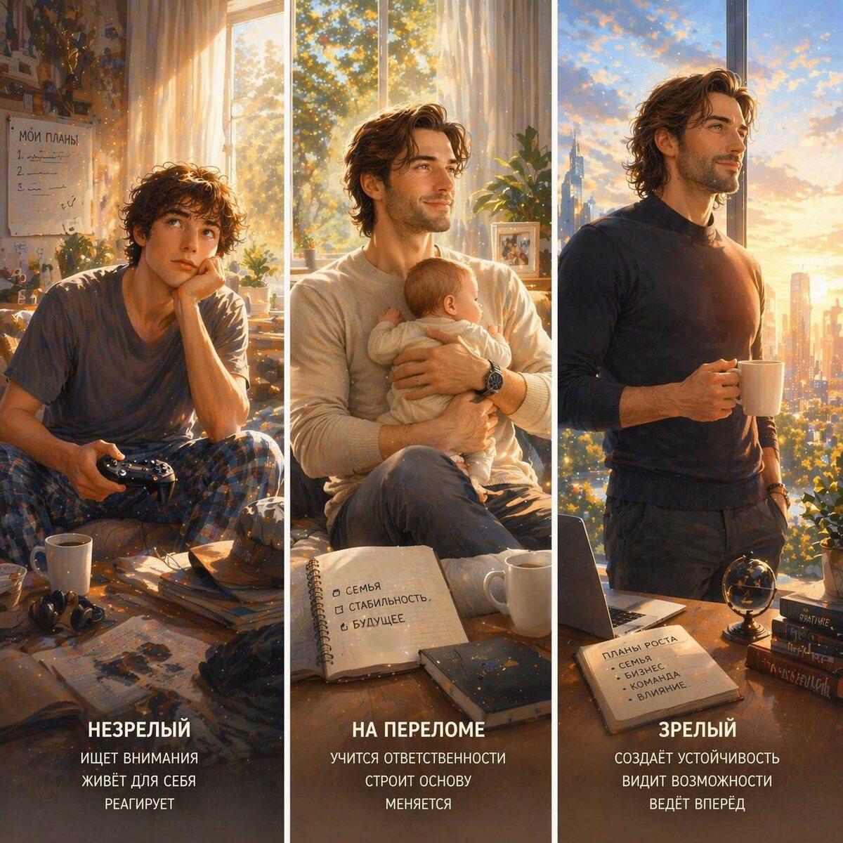 В момент, когда рождается ребёнок, для мужчины запускается развилка. Не внешняя. Внутренняя. И дальше есть два сценария. Сценарий 1. Мужчина ранее не прошёл сепарацию Если мужчина не отделился от своей матери, он бессознательно ищет «маму» в своей женщине. Не словами. А функцией: • чтобы его принимали • чтобы им восхищались • чтобы его видели • чтобы он был в центре внимания. И пока он в паре без ребёнка – это работает. Женщина даёт ему это. Но как только появляется ребёнок, происходит резкий сдвиг. Внимание женщины уходит. Не потому что она «плохая». А потому что её психика перестраивается на выживание новой жизни. И в этот момент для незрелого мужчины происходит сбой. Он сталкивается с тем, что: • он больше не в центре • его «не видят» как раньше • женщина «зациклена» не на нём • прежняя связь разрушена. И ребёнок начинает восприниматься не как продолжение, а как конкурент. Что включается дальше (защитные реакции) Психика не говорит: «я не прошёл сепарацию».