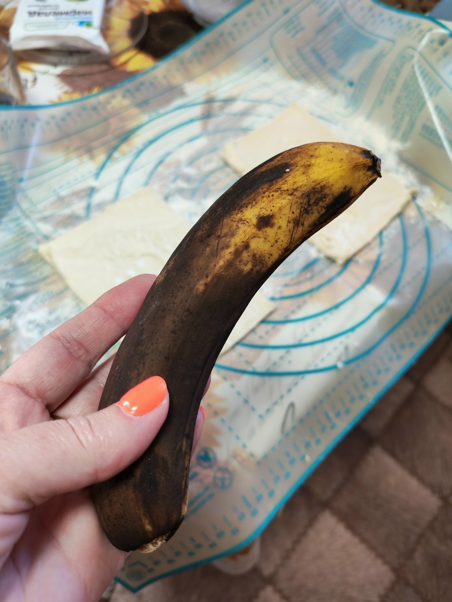 Два банана доживали свою фруктовую жизнь. Ну, знаете, как это бывает: купишь целую связку, потому что "очень-очень хочется", а потом это "хочется" куда-то девается, а бананы – нет. Так и лежат забытые бедолаги, покрываясь чернотой. Их бы выкинуть без сожаления, но, как говорится, у нас, у экономных: за что уплОчено, должно быть проглОчено. Поэтому решаюсь провести операцию по спасению бананов. Ищу в интернете, что можно сделать с переспевшими фруктами. И вот оно — решение! Рулетики! Все до неприличия просто: нужны бананы и слоеное тесто. Тут же вспомнила, что в одном из ящиков морозилки, под горой пакетов с ягодами, притаилась упаковка. Я это тесто так давно купила, что его тоже пора было спасать от забвения.