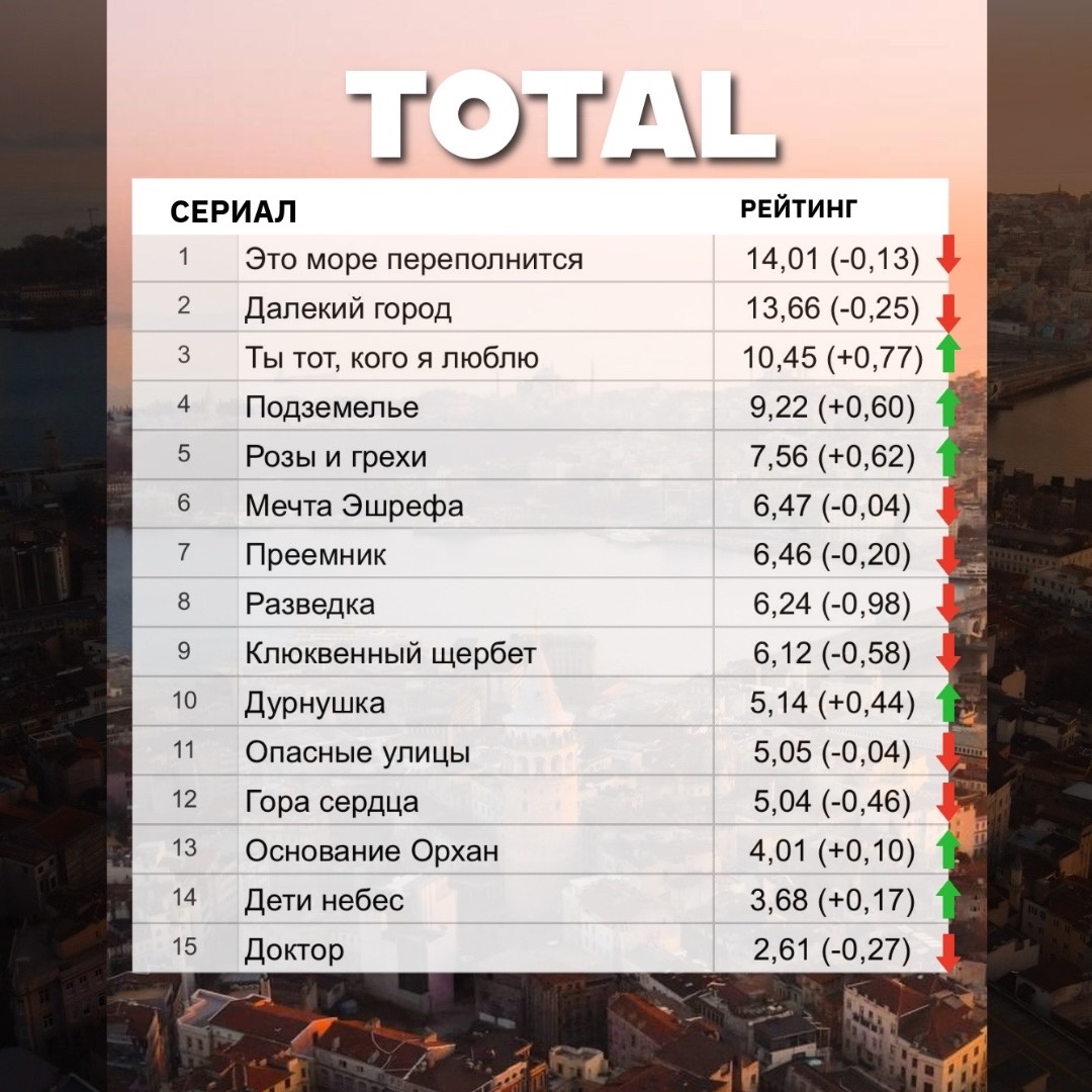 В категории Total третью строчку занимает «Ты тот, кого я люблю». Одной из главных причин интереса стала яркая экранная химия между Эрканом и Диджле. Зрители настолько прониклись их взаимодействием, что уже активно обсуждают возможный роман актеров в реальной жизни, хотя подтверждений этим слухам нет.