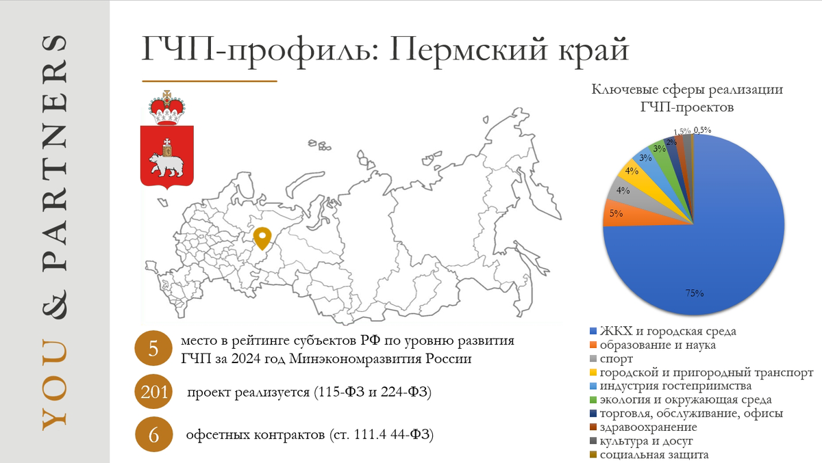 🏆 Место в рейтинге - 5 Согласно итоговой оценке рейтинга субъектов РФ по уровню развития ГЧП за 2024 год (Минэкономразвития России), Пермский край занимает 5 место (сохранив такую же позицию, как в 2023 году). 🧮 Количество проектов По данным РОСИНФРА в регионе реализуется 201 ГЧП-проект (учтены проекты по 115-ФЗ и 224-ФЗ на стадиях от предынвестиционного этапа до завершения проекта). 🧩 Сферы реализации проектов: - ЖКХ и городская среда (150 проектов);