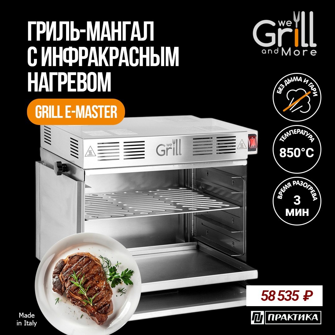 Ну что, скоро май, а это значит, начинается сезон открытых кухонь, террас и выездных мероприятий. Если вы работаете с кейтерингом, участвуете в фестивалях или готовите на выезде (свадьбы, корпоративы, дни рождения) рекомендуем присмотреться к этому решению! GRILL E-MASTER - компактный итальянский гриль с инфракрасным нагревом, который реально упрощает работу «в полях». Разборная конструкция, вес всего около 18 кг. Сложили в сумку, привезли, собрали и сразу в работу. Без лишней подготовки и сложной логистики! КАКИЕ ПРИЕМУЩЕСТВА ИНФРАКРАСНОГО НАГРЕВА? ◽️Выход на рабочую температуру за считанные минуты ◽️Максимальный нагрев до 850°C - идеальная корочка без пересушивания ◽️Сок остаётся внутри - минимальные потери веса продукта ◽️Супербыстрое приготовление ◽️Практически нет дыма и гари ЧТО МОЖНО ГОТОВИТЬ? Вот где вы сможете раскрыть такой гриль максимально: 🥩 Гриллинг: стейки, бургеры, курица, рыба 🍕 Запекание: пицца, овощи, морепродукты 🍮 Карамелизация: крем-брюле, фрукты, соусы