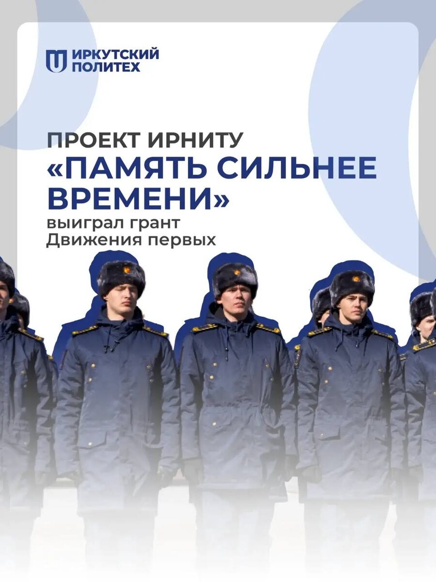 ! 🎉 Политеховцы реализуют Всероссийский проект «Память сильнее времени» 🇷🇺 По словам заместителя начальника Управления по молодёжной политике Кристины Веретенниковой, проект направлен на преодоление разрыва между поколениями и создание живого, искреннего диалога о патриотизме и исторической памяти. Что ждёт участников? ➡️ Этап 1: Курсанты — наставники. 20 курсантов Военного учебного центра пройдут подготовку по методикам интерактивного общения и углублённому изучению истории Великой Отечественной войны. Затем они проведут 40 выездных лекций-встреч в школах, колледжах и вузах Иркутска и области. Формат — диалог: семейные фотохроники, обсуждение ценностей, поиск активных ребят для участия в форуме. ➡️ Этап 2: Всероссийский молодёжный форум «Россия – наш дом». В 2026 году грантовую поддержку от «Движения первых» получили 496 проектов из 76 регионов на общую сумму 1,4 млрд рублей. Гордимся нашими политеховцами 💙 Следите за новостями проекта — впереди много интересного! 👻 МАХ | �