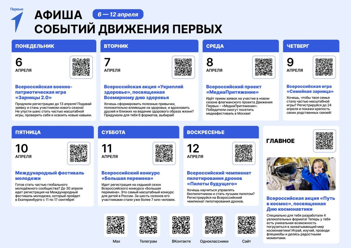 ! С 6 по 12 апреля нас ждёт насыщенная программа событий - выбирай своё и участвуй 👇 ПОНЕДЕЛЬНИК | 6 апреля Всероссийская военно-патриотическая игра «Зарница 2.0» Продлили регистрацию! Успей стать частью нового сезона и прокачать навыки. 👉 зарница.будьвдвижении.рф/ ВТОРНИК | 7 апреля Акция «Укрепляй здоровье» ко Всемирному дню здоровья 6 форматов участия — выбирай и формируй полезные привычки вместе с Первыми! 👉 https://projects.pervye.ru/promotions/5a887b97-08cc-41b8-8f49-74b0c0d808cf СРЕДА | 8 апреля Проект «МедиаПритяжение» Старт нового сезона! Создавай контент, заявляй о себе и попади на медиафестиваль в Москве. 👉 медиа.будьвдвижении.рф/ ЧЕТВЕРГ | 9 апреля Игра «Семейная зарница» Участвуй всей семьёй и покажи, что такое настоящая команда! 👉 https://projects.pervye.ru/projects/cef3e7bf-8192-4a3d-9cee-87df32c8aea5 ПЯТНИЦА | 10 апреля Международный фестиваль молодёжи Открыт набор — стань частью глобального молодёжного движения! 👉 https://wyffest.com/events/mfm2026 СУББОТА