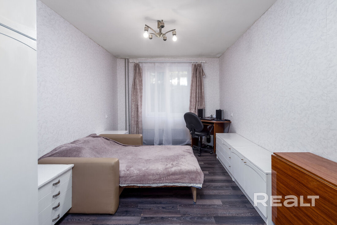 Самая бюджетная — однокомнатная квартира (а в нашей подборке все будут однокомнатными) на пятом этаже девятиэтажного дома по адресу Алеся Бачило*, 7 корпус 3. Ближайшая станция метро — «Могилевская», до нее около пяти километров, а на автобусе можно добраться минут за 20.