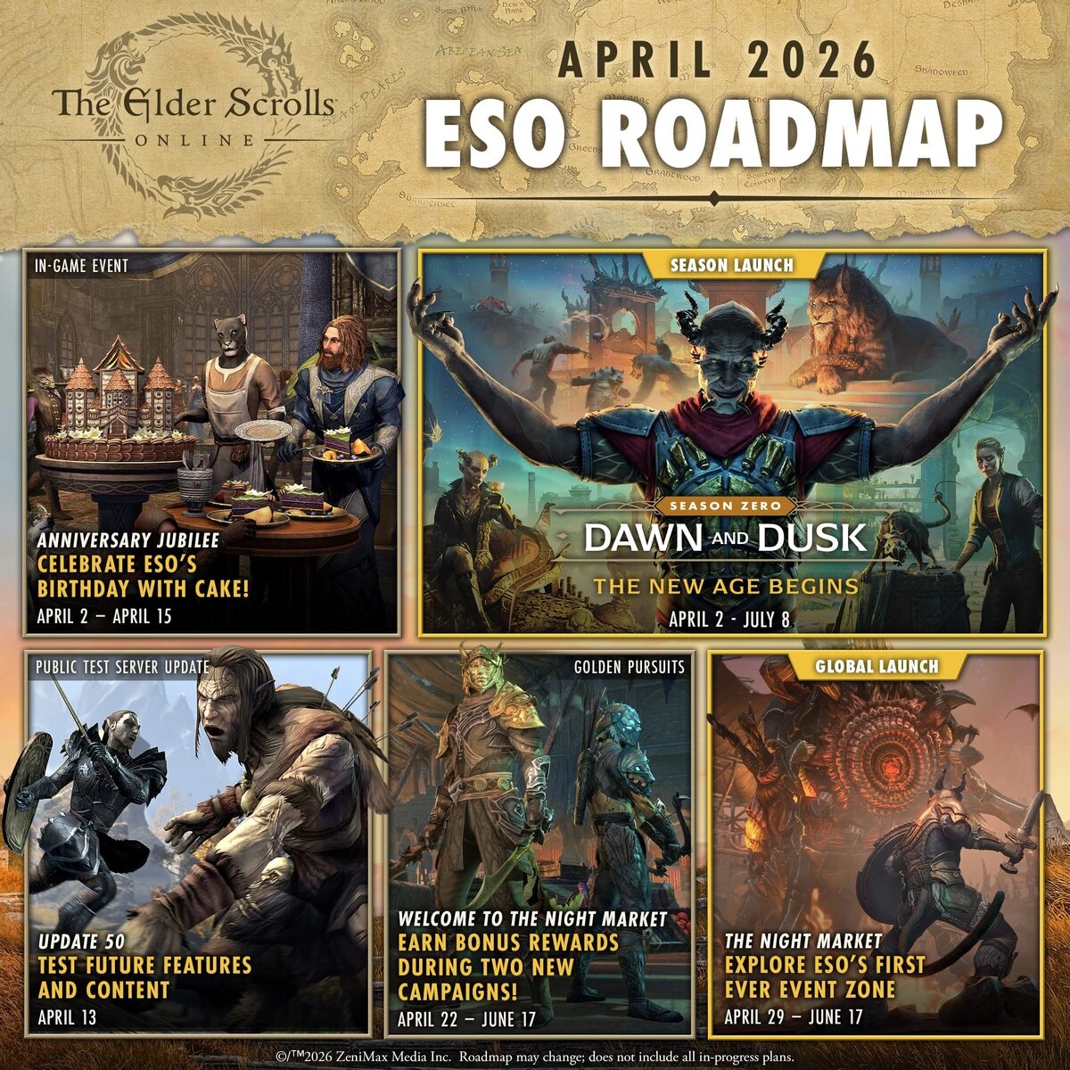 ZeniMax Online Studios анонсирует важнейший апрель для The Elder Scrolls Online и игрокам стоит приготовится к действительно важному периоду. В четверг, 2 апреля, на всех платформах стартует нулевой сезон «От рассвета до заката» (Dawn to Dusk). Сезон продлится до 8 июля и представит множество новых функций, о которых команда уже сообщила, включая треки прогресса в Тамриэльских томах, зону «Ночной рынок» и многое другое, что еще не было представлено. Также 2 апреля начнется юбилейное событие, посвященное 12 годам со дня запуска проекта. Конечно же, будут торт, автоматический универсальный бафф +100% к опыту, а также новые и вернувшиеся награды. Среди них — новый стиль костюма Dapper Daredevil. Нулевой сезон вот-вот стартует, и команда уже с нетерпением ждет обновления 50 и изменений в базовой игре. 9 апреля выйдет стрим с обновлениями от разработчиков, а 13 апреля — релиз обновления 50 на тестовом сервере (PTS). Остальная часть апреля также будет насыщена событиями. Новейшая Vengeance C